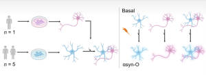 Figure 1. [Figure from D’Sa, et al.] hiPSC-derived astrocytes (blue) were generated from five healthy donors. Cortical neurons (pink) were derived from a sixth healthy donor. Cellular responses to stimulation with oligomeric alpha synuclein (alpha synuclein-O) in astrocyte-only, neuron-only, and astro-neuronal cultures were examined simultaneously.
