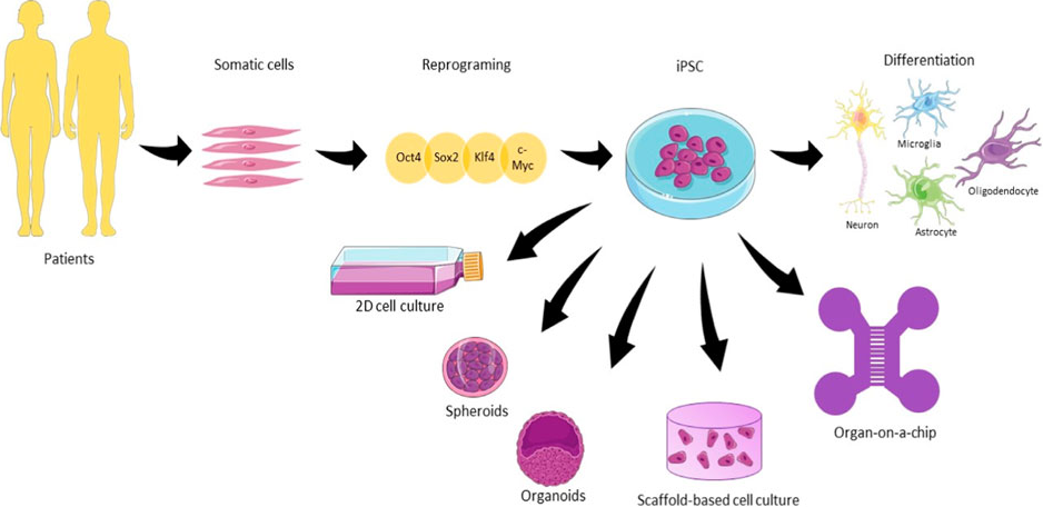 Organoids: These models are 3D cell cultures that can preserve the cellular interactions found in human organs. Specifically, human induced pluripotent stem cells (hiPSCs) have emerged as a key tool for neurological modelling. hiPSCs can differentiate into many cell types, self-renew, and are obtained from somatic cells in humans. These characteristics allow for a more accurate disease model.
