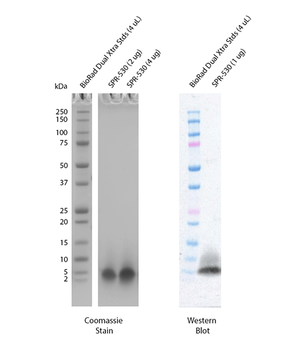 SDS-PAGE analysis of Human Synthetic Amyloid Beta Peptide 1-40 Monomers on a 4-12% Bis-Tris gel (left). Western Blot of Human Synthetic Amyloid Beta Peptide 1-40 Monomers using an anti-amyloid beta 1-16 monoclonal antibody [6E10] (Biolegend Cat # 803012) at 1:1000. Secondary antibody was a goat anti-mouse:HRP at 1:4000. Exposed 5 seconds (right).
